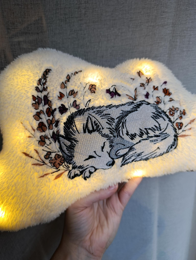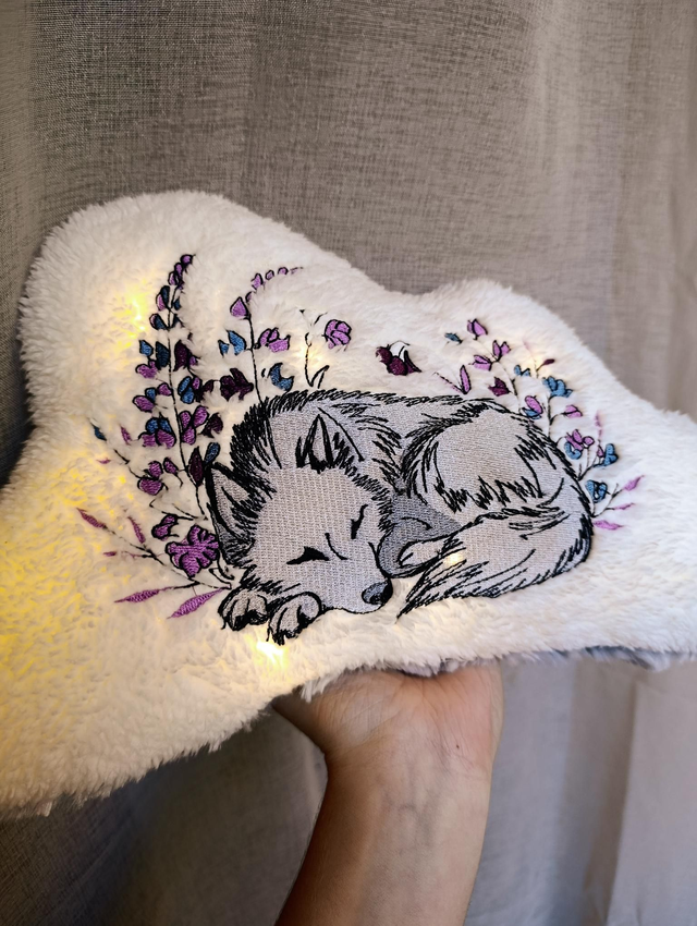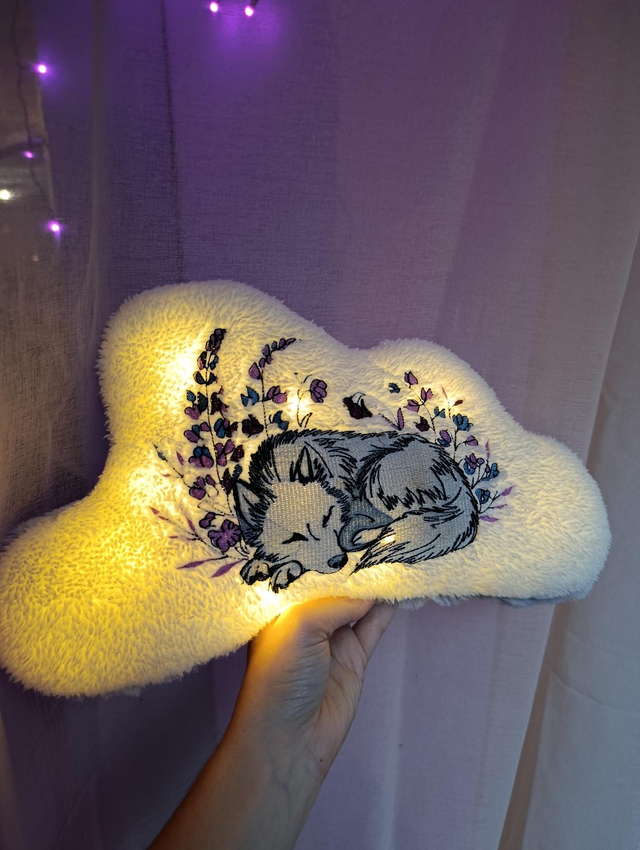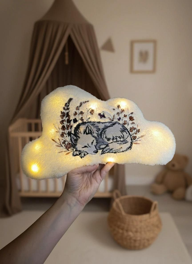 Un petit louveteau brodé, qui s’endort dans un nuage tout doux et éclaire les nuits de bébé sans jamais trop briller.