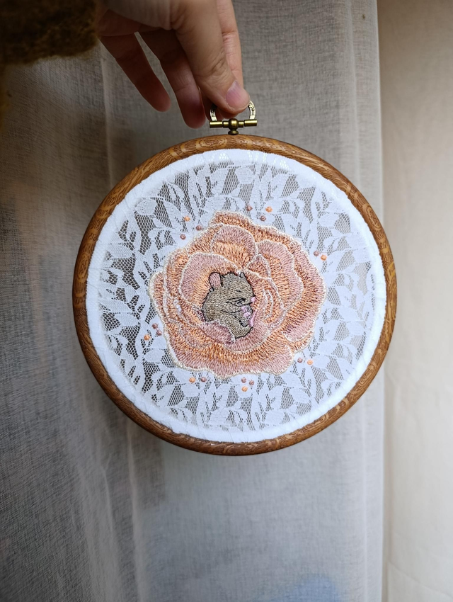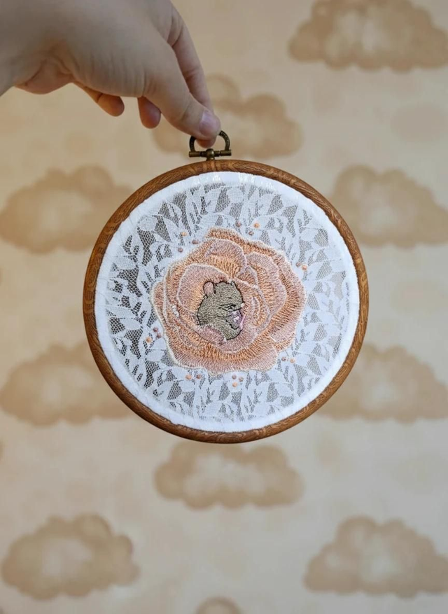 Voici ma petite souris endormie, nichée au cœur d’une fleur, comme dans un cocon de tendresse.