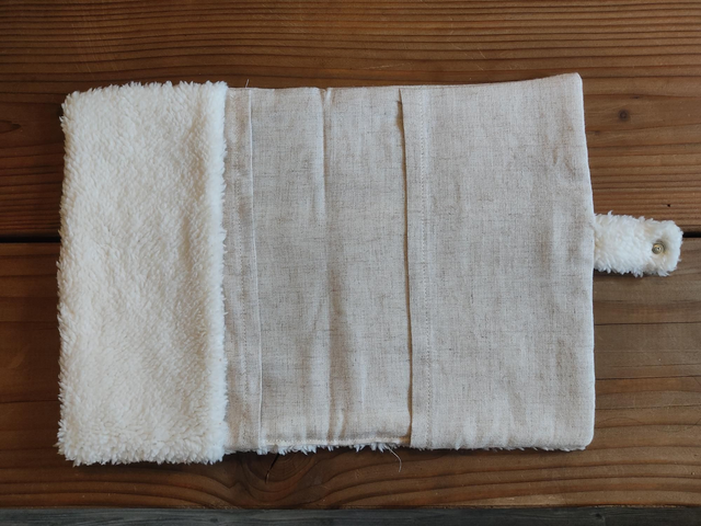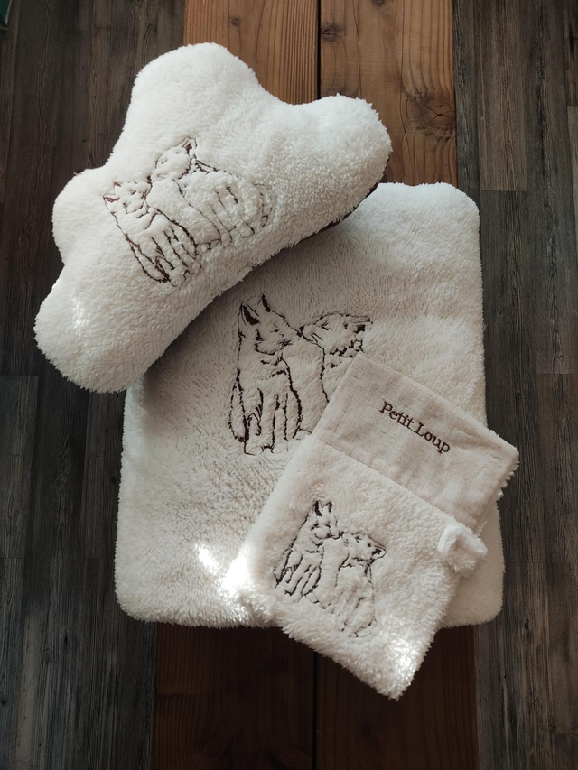 En fausse fourrure moelleuse, brodé Louveteaux, avec un intérieur en coton & lin naturel, il protège avec tendresse les premiers souvenirs de vie.